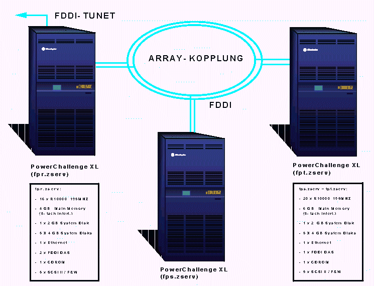 Das Gesamtsystem besteht aus drei Servern SGI Power Challenge XL mit insgesamt