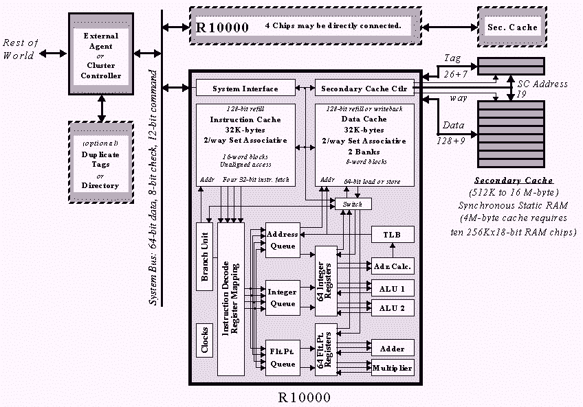 Drei Instruction Queues, die Integer-, Floating Point- und die Address Queue greifen über 64 Physical Registers auf 2 Integer Arithmetic Logic Units und 3 Floating Point Units zu. Das folgende Blockdiagramm zeigt die Komponenten des R10000 Prozessors. Weitere Informationen befinden sich auch unter URL:http://www.sgi.com/.