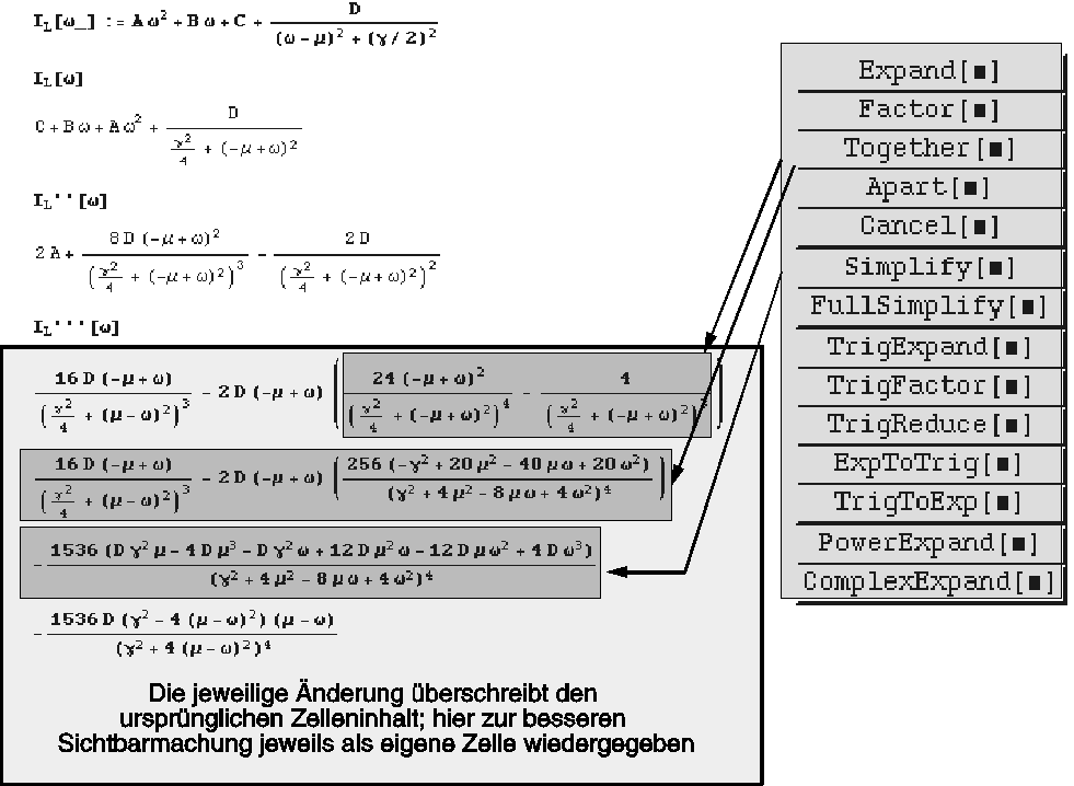 Als Beispiel diene die Umformung einer einfachen Formel (Abb. 2). Mit Hilfe der hier gezeigten Palette (es ist möglich, sich praktisch jede Funktion in eine Palette einzubauen) können die einzelnen Teile der Formel oder Gleichung durch Selektieren und Anklicken der Funktion in der Palette umgeformt werden. Ein recht hilfreicher neuer Befehl ist dabei auch FullSimplify[expression].