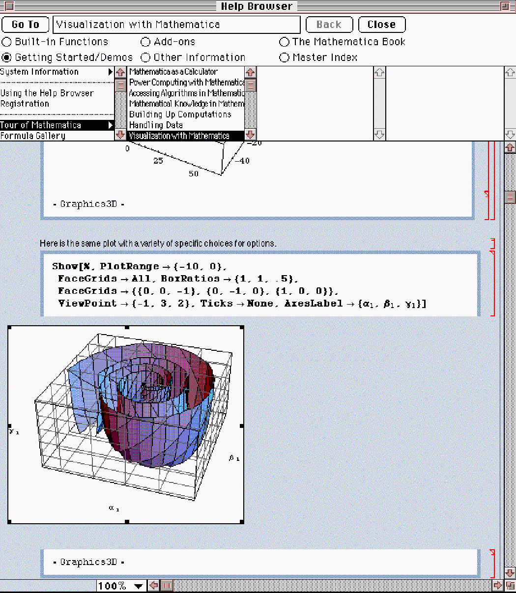Die große Umfang an Funktionen und Packages wurde noch erweitert. Eine der besonderen Stärken von Mathematica bleiben dabei natürlich weiters die vielfältigen Möglichkeiten der Visualisierung, wie in Abbildung 4 an Hand des entsprechenden Unterkapitels in der in die Help Funktion integrierten „Tour of Mathematica“ gezeigt.