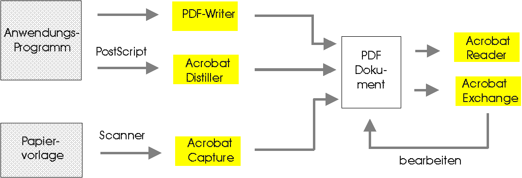 Nach der Seitenbeschreibungssprache PostScript, die heute als Standard für die Ansteuerung von Druckern und anderen Ausgabegeräten gilt, hat Adobe das Portable Document Format (PDF) entwickelt und auf den Markt gebracht. PDF erlaubt einen universellen Austausch von Dokumenten mit unverändertem Layout, unabhängig von Betriebssystem und Anwendungsprogramm. Inzwischen sieht man immer mehr PDF-Files im World Wide Web. Adobe verfolgt dabei die Politik, den Reader kostenlos zur Verfügung zu stellen, sodaß jeder die Dokumente lesen kann. Zur Erstellung von PDF-Files benötigt man die entsprechende Software von Adobe (Acrobat).