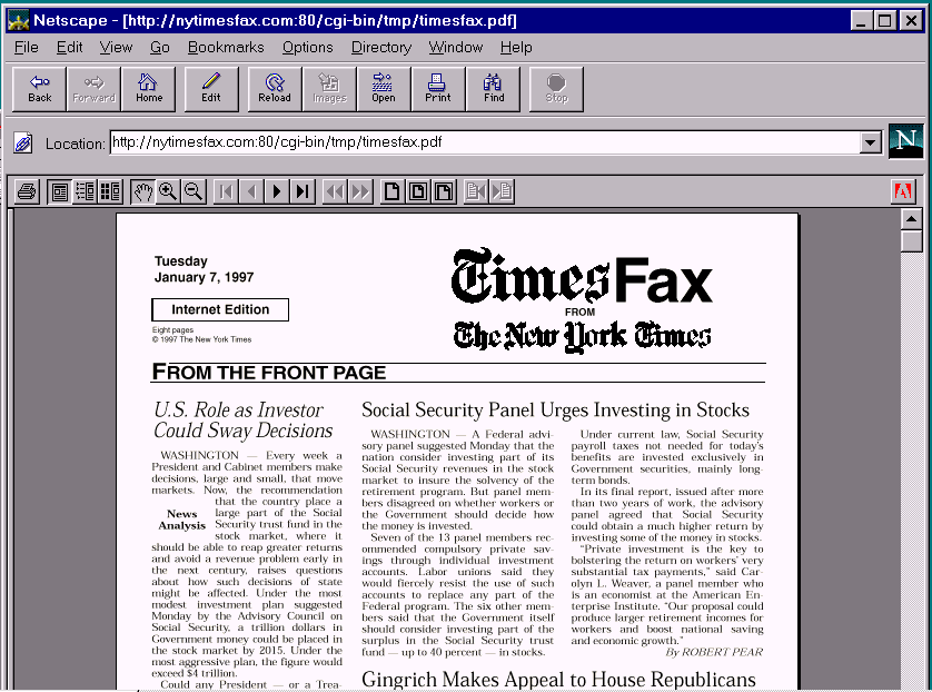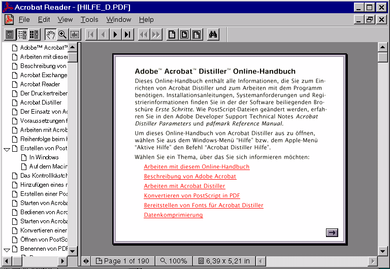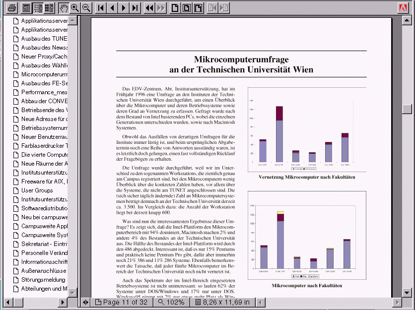 Über WWW kostenlos ladbar ist bereits die Version 3.0 (http://www.adobe.com/ oder lokaler Mirror http://gd.tuwien.ac.at/publishing/adobe/acrobatreader/). Die aktuelle Version 3.0 in Verbindung mit Netscape ab Version 3 bietet den Vorteil, daß bei Aufruf eines PDF-Dokuments Acrobat Reader nicht mehr als externer Viewer gestartet wird. Das PDF-Dokument wird im Netscape-Fenster angezeigt, wobei die Werkzeugleiste des Readers sichtbar wird.