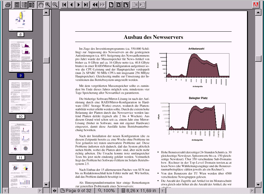 Das PDF-Dokument der PIPELINE 20 ist knapp über 1/2 MB groß, während die Ausgangs-PostScript-Files etwa 37 MB benötigten (vor allem wegen der eingebetteten Graphiken). Dafür müssen längere Zeiten für das Drucken in Kauf genommen werden.